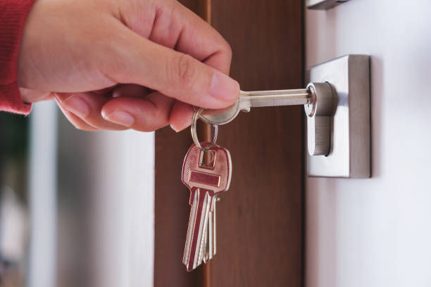 OPPRESSIONS We were locked out;Emil forgot his phone somewhere.Locksmith forgot his tools. Closeup image of a hand using keys to unlock the door